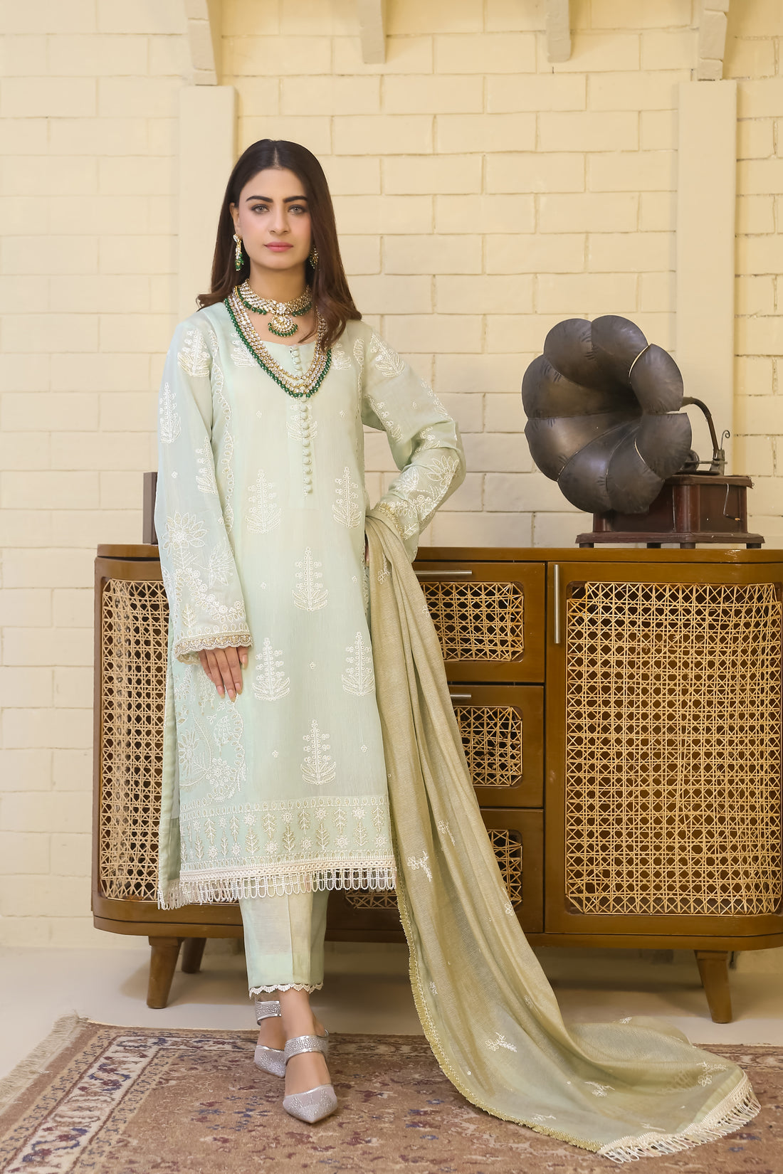 Lurex Embroidered Messuri Khaddi Net Dupatta Lurex Embroidered Messuri Shirt Front Centre Pannel, Front Left & Right Pannel, Shirt Back & Sleeves With Embroidered Border For Front & Back. Dyed Swiss Cotton Inner With Raw Silk Trouser